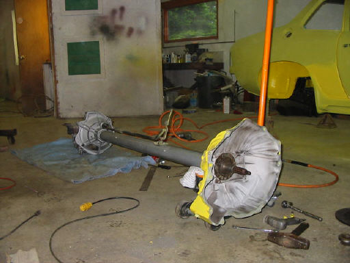 The transmission, drive tube, bell housing and rear suspension is all back under now. When I get the new chrome base pan for the engine I can install that also. Oh yaeh I need to grind and polish all the stainless steel engine bolts first and bolt the intake, timing chain cover etc.