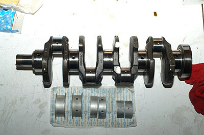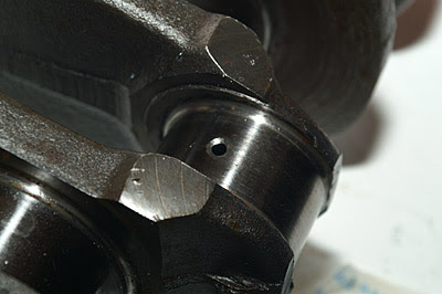 And, here are pix of the stroker crank, showing the cross-drilling referenced above, as well as closeups of the weld & regrind at a couple of the rod journals. Note also the rod and main bearings in the first couple of photos. Nick, interesting that in my set of rod bearings, all of halves have the oiling pin hole...