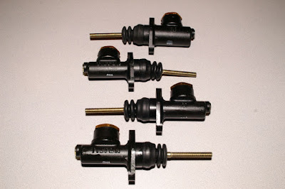 On top, we have a 15/16" master cylinder to be used for the clutch master; following we have 3/4", 7/10" and 5/8" cylinders, which will allow me to play around with the pairing and balance for the dual cylinder setup for the brakes.