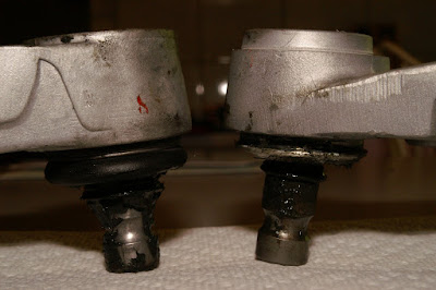 I'm not sure if the 944 vs. 951 part number is an indicator, but the dead giveaway as far as I can tell is that the cup that the ball joint sits in has a different casting between the two versions. In the following closeup, you can see the rebuildable arm on the left, and the non-rebuildable one on the right. You can also see in the profile shot how the one on the right has a different casting. Note also the removable circlip on the LHS arm. I believe one of the other ways to tell them apart is by the type of moisture barrier used (which I've already removed on both arms), but I'm not positive that this is conclusive. The rebuildable one had a dark amber type material that I had to heat up to remove. The non-rebuildable one had a light grey rubbery material that was easy to scrape away with a razor knife.