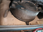 Once you come to from this enlightening moment, fix the fan in place permanently, carefully remount the saucer and check its operation. Then remount the shroud with fresh gorilla snot, making certain it seals all the way around the opening in the bodywork. You do not want rain water running off the windshield to enter your heater box.